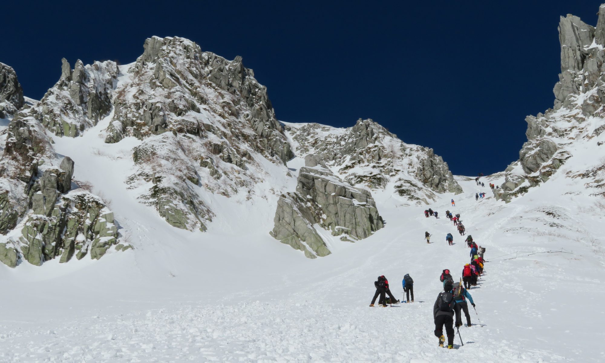 アイゼン・ピッケルが使えても、深い雪ややわらかい新雪の上を歩く技術がなければ、アルパインエリアに到達するのは難しいです。スノーシューやワカン、またはツボ足での雪上歩行技術をしっかりと磨くことが重要です。
